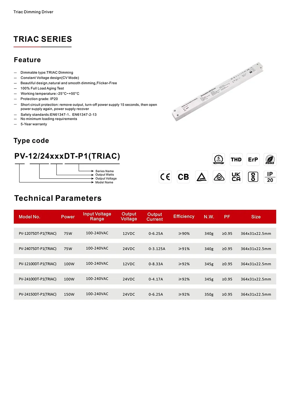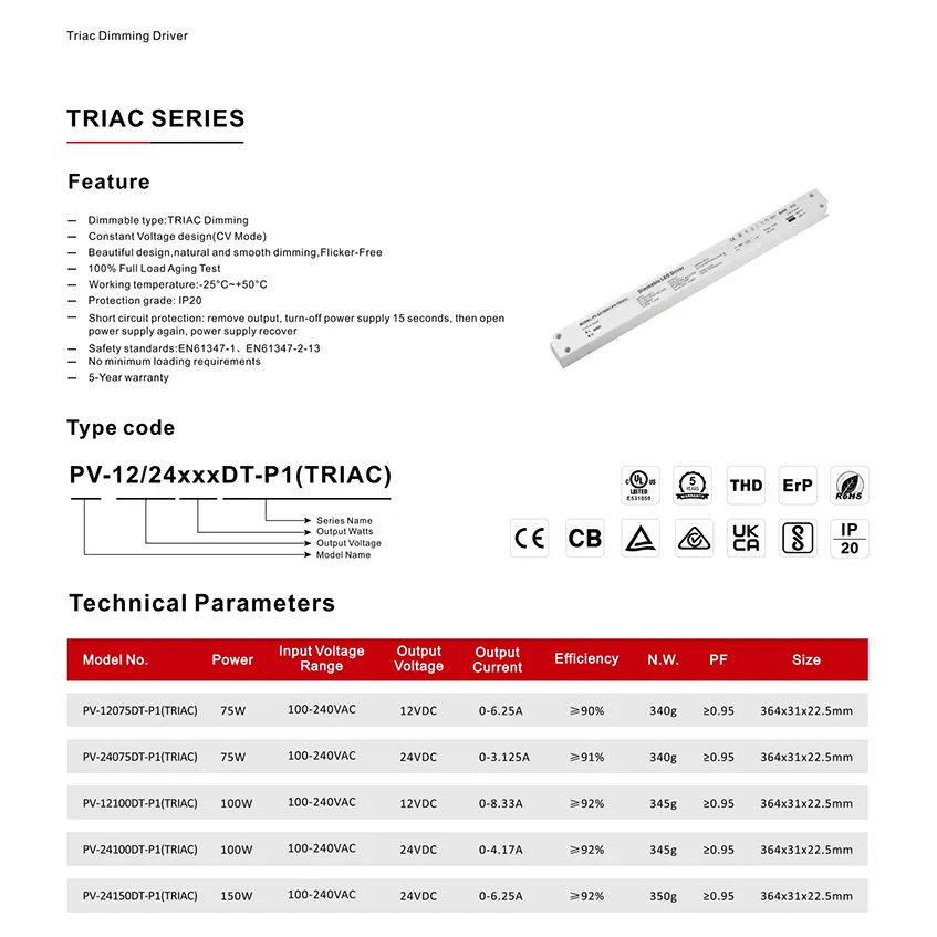 ข้อมูลจำเพาะของไดรเวอร์ LED แบบหรี่แสงได้ Triac ของ Starwell แรงดันคงที่: