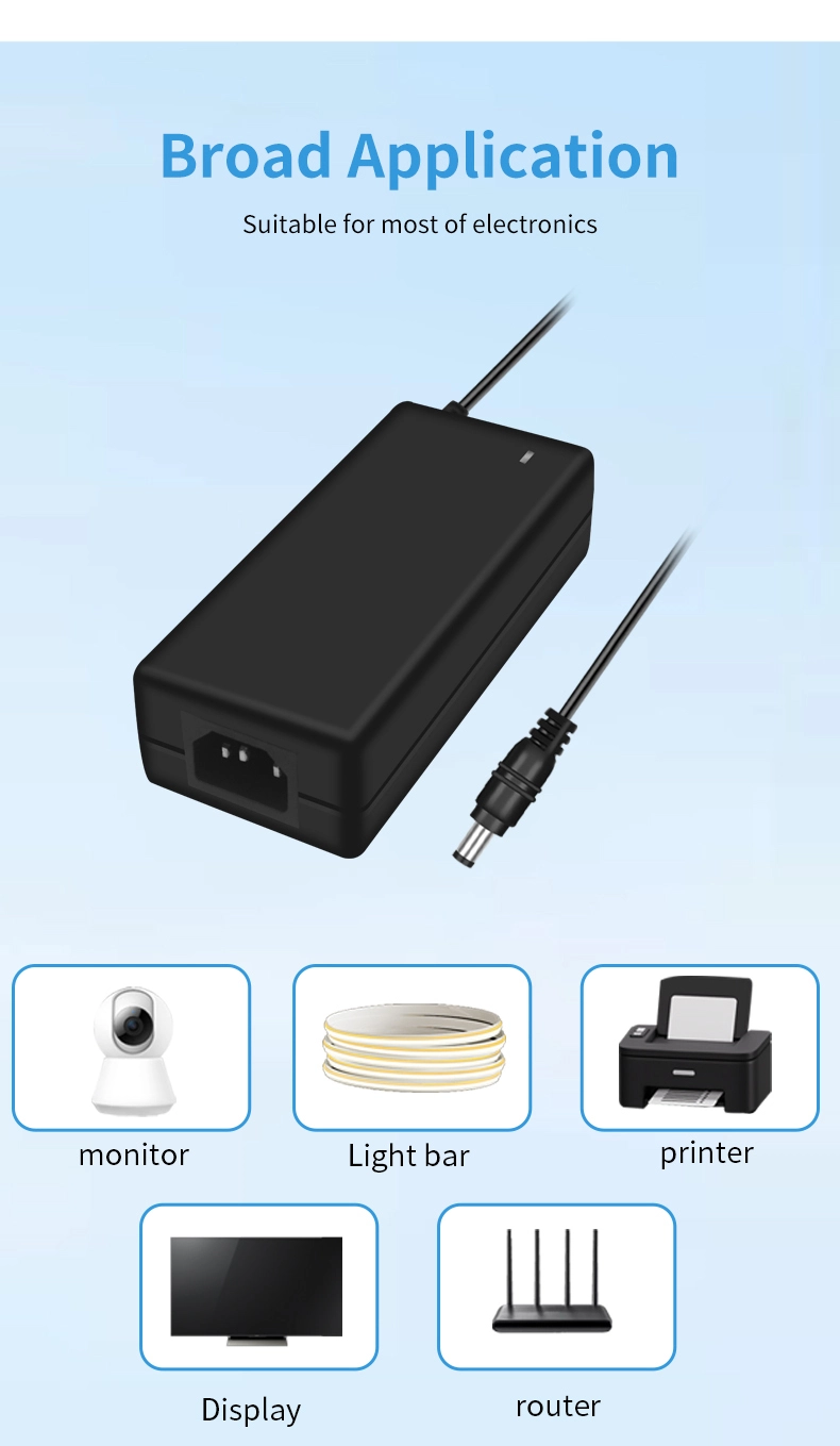อินพุตแรงดันไฟฟ้า AC กว้าง 100-240V เข้ากันได้กับโครงข่ายไฟฟ้าในกว่า 100 ประเทศทั่วโลก สายเคเบิลเอาต์พุตขยาย 1.5 ม. (เส้นผ่านศูนย์กลาง 1.0 มม.²) จับคู่กับขั้วต่อ DC ที่หมุนได้ 180° ปรับให้เข้ากับสถานการณ์การติดตั้งต่างๆ ด้วยขนาดที่กะทัดรัดเพียง 120×60×30 มม. จึงมีขนาดเล็กกว่าอะแดปเตอร์แบบเดิมที่มีกำลังไฟเท่ากันถึง 35% โดยมีน้ำหนักเพียง 280 กรัม ช่วยเพิ่มความสามารถในการพกพาได้ถึง 50%