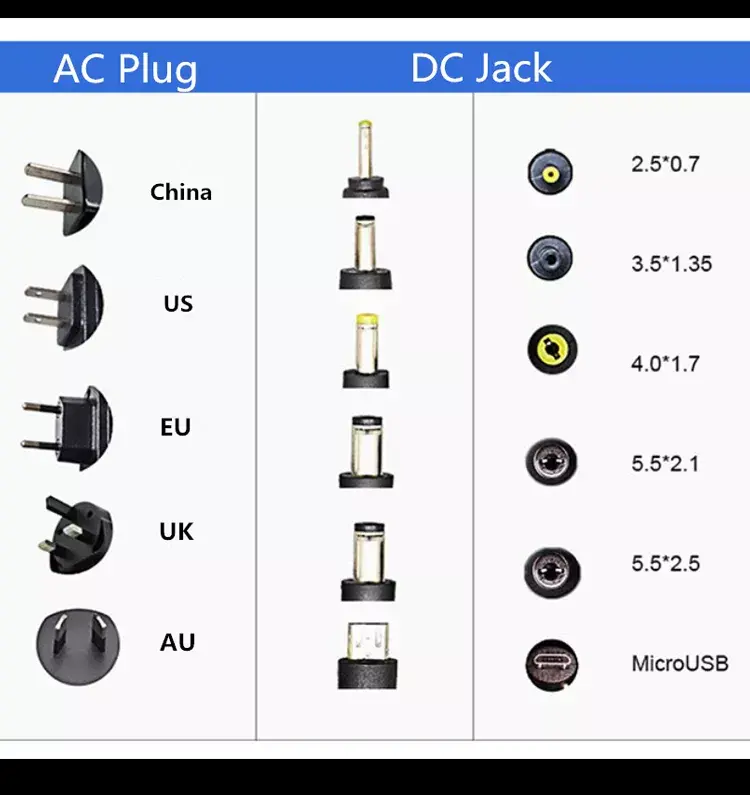 - ประเภทตัวเชื่อมต่อ: ขั้วต่อ DC บาร์เรลมาตรฐาน (ขนาดทั่วไป ได้แก่ 5.5 มม. × 2.1 มม. หรือ 5.5 มม. × 2.5 มม. ปรับแต่งได้ตามความต้องการของอุปกรณ์)