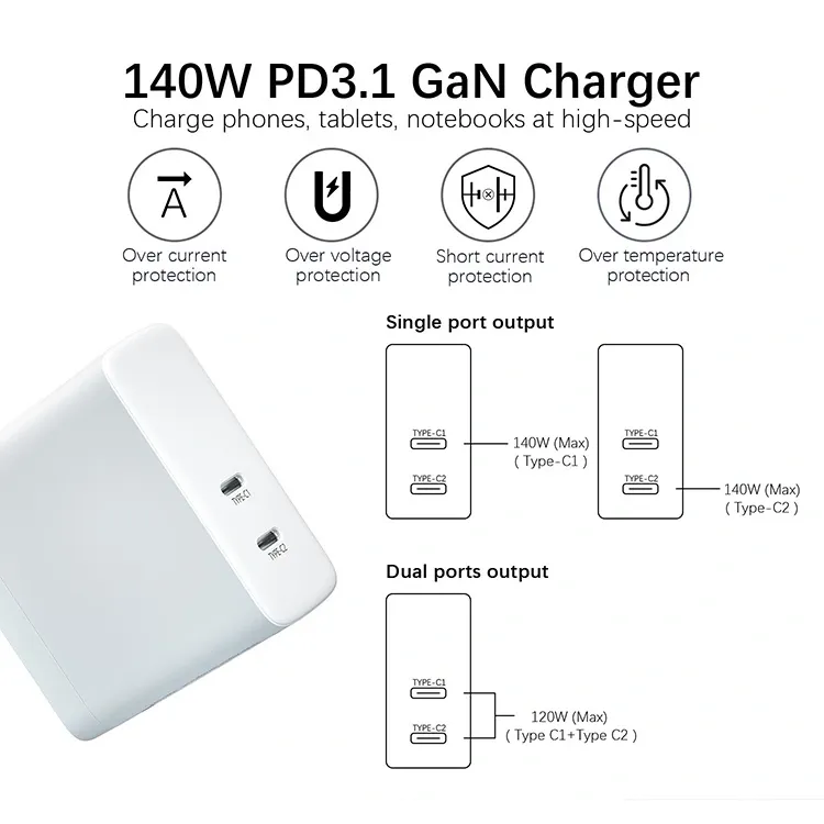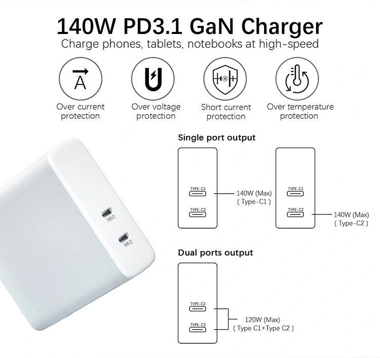 GAN: ด้วยชิป GaN ขนาดของเครื่องชาร์จ PD 140W จะลดลง 50% เมื่อเทียบกับเครื่องชาร์จแบบเดิม ทำให้ง่ายต่อการพกพาสำหรับการเดินทางเพื่อธุรกิจหรือใช้ในสำนักงาน โดยไม่ต้องใช้พื้นที่เสียบปลั๊ก