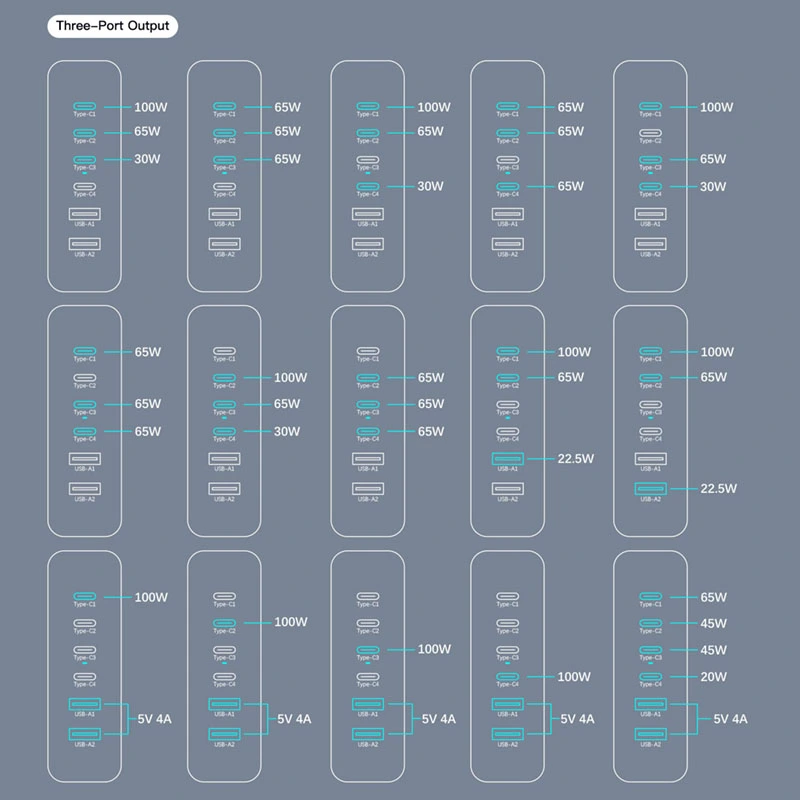 เอาต์พุต USB C1/C2/C3/C4: 5V/3A 9V/3A 12V/3A 15V/3A 20V/5A (สูงสุด 100W) USB A1/A2: 5V/3A 9V/2A 12V/1.5A (สูงสุด 18W) |