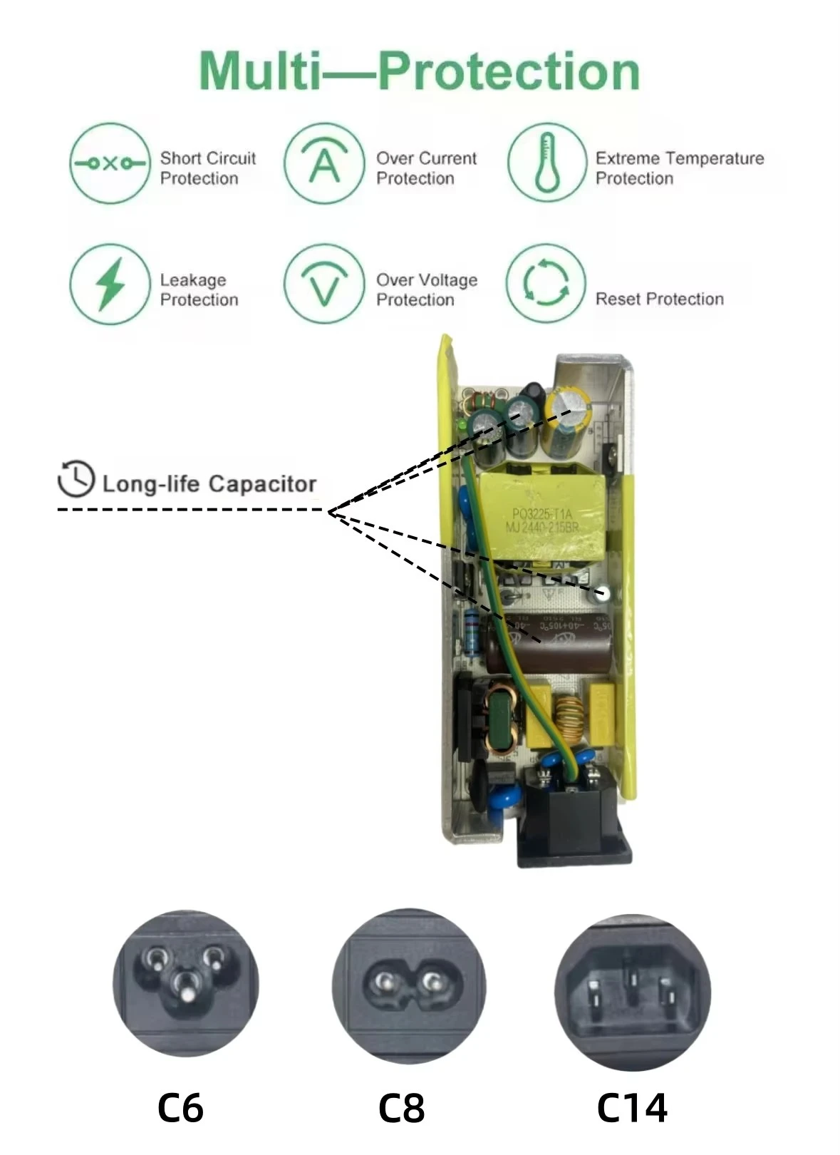 การป้องกันความปลอดภัยที่ครอบคลุม: การป้องกันแบบรวมซึ่งรวมถึงการป้องกันกระแสไฟเกิน (OCP), การป้องกันแรงดันไฟฟ้าเกิน (OVP) และการป้องกันไฟฟ้าลัดวงจร (SCP) จะช่วยป้องกันความเสียหายที่เกิดกับทั้งอะแดปเตอร์และอุปกรณ์อันมีค่าของคุณ