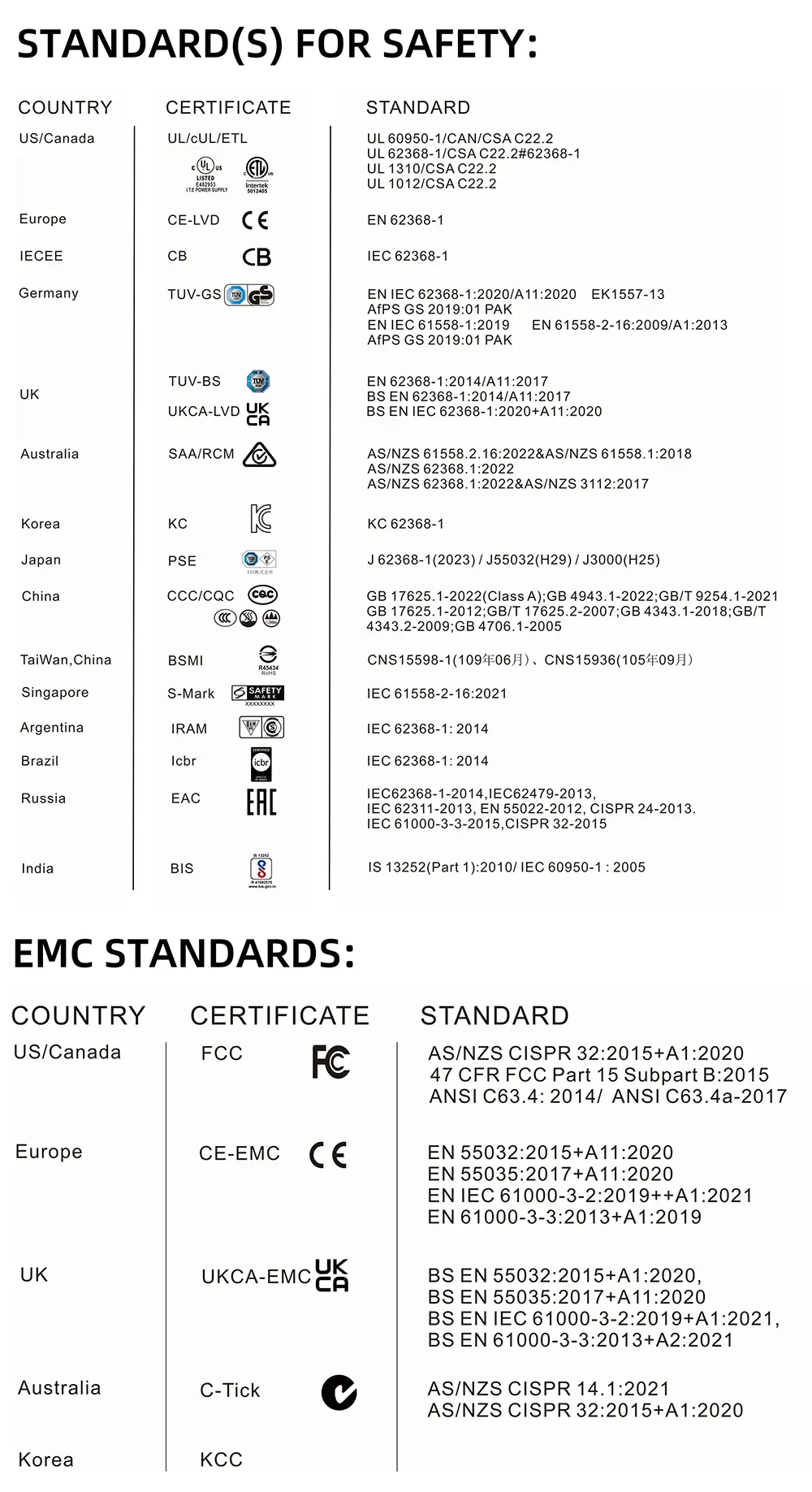 ความปลอดภัยของคุณเป็นสิ่งสำคัญยิ่ง อะแดปเตอร์นี้ได้รับการออกแบบและผลิตเพื่อให้ตรงตามมาตรฐานสากลที่เข้มงวด ไม่เพียงแต่รับประกันประสิทธิภาพที่เชื่อถือได้ แต่ยังอุ่นใจอีกด้วย เป็นไปตาม ETL CE FCC TUV GS CB PSE KC KCC BIS SAA RCM c-Tick CCC UKCA UL cUL RoHS ซึ่งควบคุมความปลอดภัย สุขภาพ และการคุ้มครองสิ่งแวดล้อม