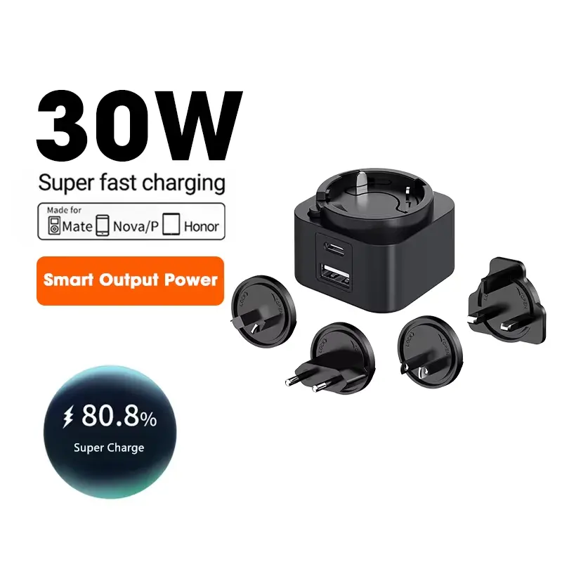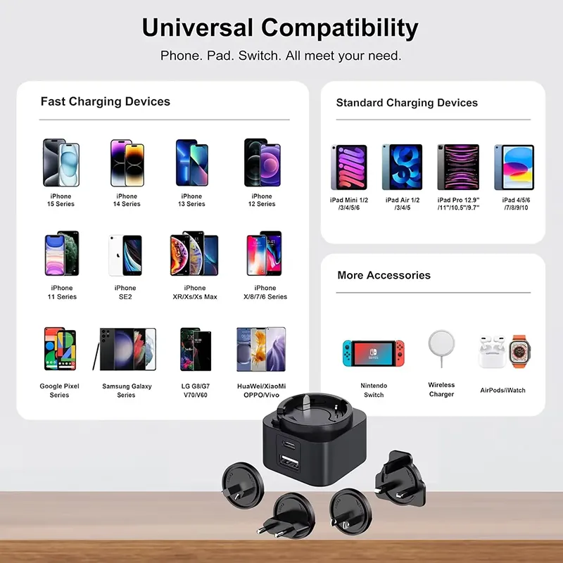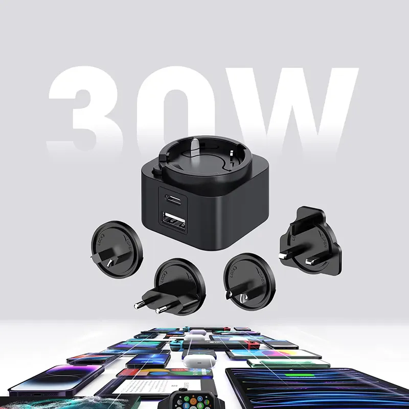 ความคล่องตัวคือกุญแจสำคัญ การออกแบบพอร์ตคู่ (USB-C/USB-A) ช่วยให้คุณสามารถชาร์จอุปกรณ์สองเครื่องพร้อมกันได้ เครื่องชาร์จ PD แบบปลั๊กเปลี่ยนได้ 30W มีชุดปลั๊กแบบเปลี่ยนได้ (US/EU/UK/AU) ทำให้เป็นเพื่อนร่วมเดินทางที่สมบูรณ์แบบของคุณทั่วโลก ไม่ว่าคุณจะชาร์จสมาร์ทโฟน แท็บเล็ต หรือแล็ปท็อป ความเข้ากันได้แบบสากลช่วยให้มั่นใจได้ถึงประสิทธิภาพระดับสูงสุด