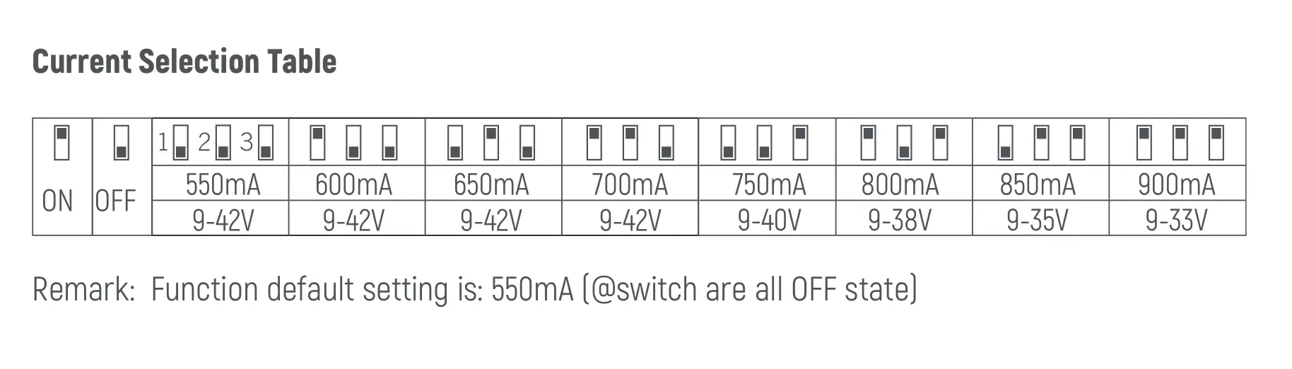 กระแสไฟขาออก: ปรับได้ โปรดดูรายละเอียดในตารางการเลือกปัจจุบัน
