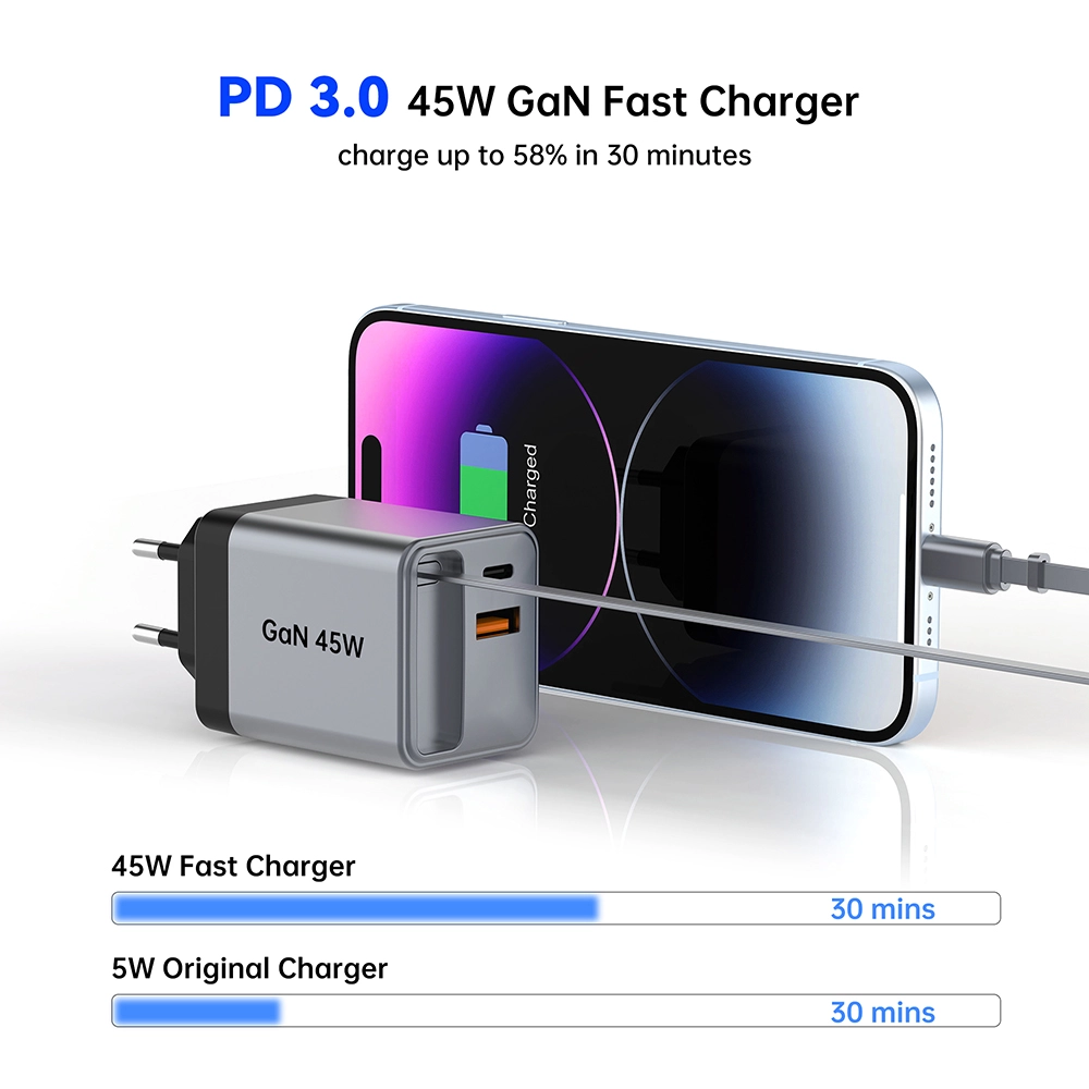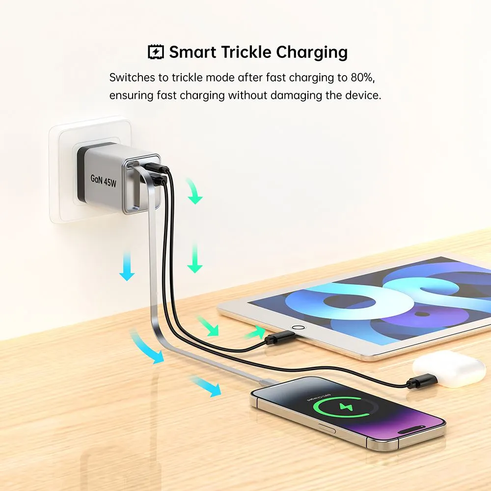 การชาร์จความเร็วสูง: เครื่องชาร์จแบบเร็วแบบยืดหดได้ GAN 45W มีเอาต์พุตอันทรงพลังที่ 45 วัตต์ คุณจึงมั่นใจได้ว่าจะชาร์จอุปกรณ์ของคุณได้อย่างรวดเร็ว
