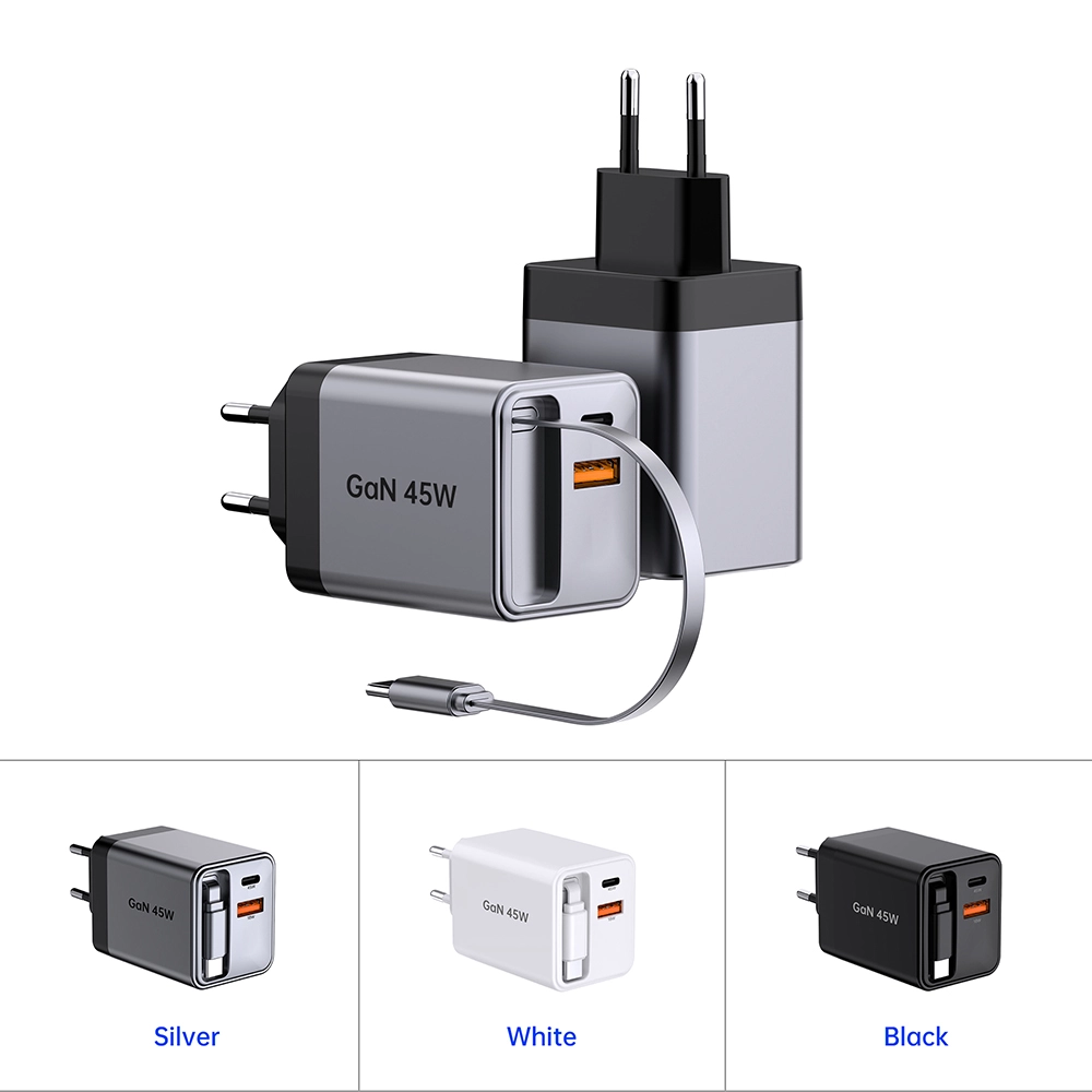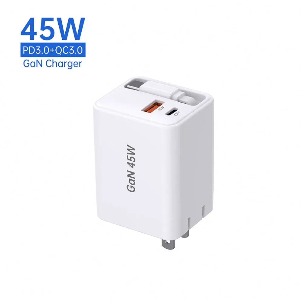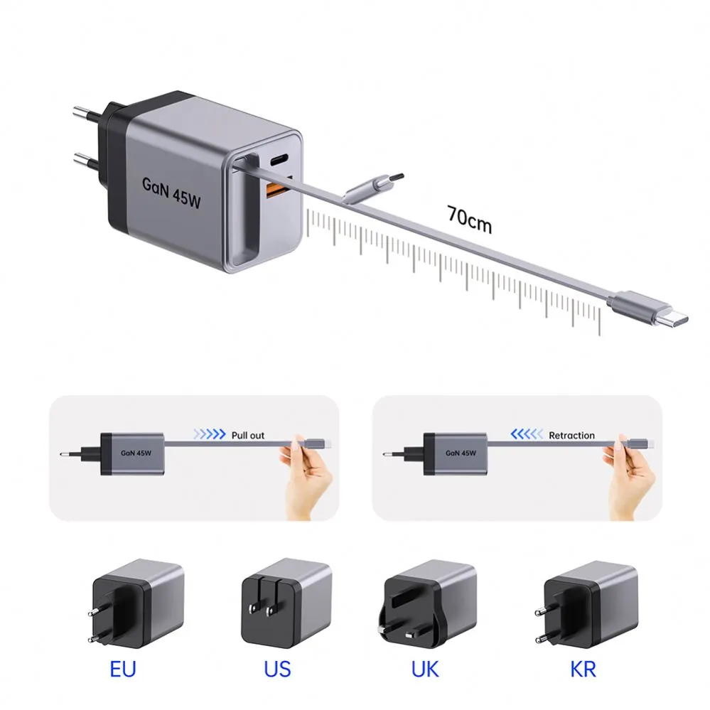 GAN 45W Retractable Fast Charger USB-CABLE+USB-A+USB-C 45W PD เครื่องชาร์จพร้อมสาย