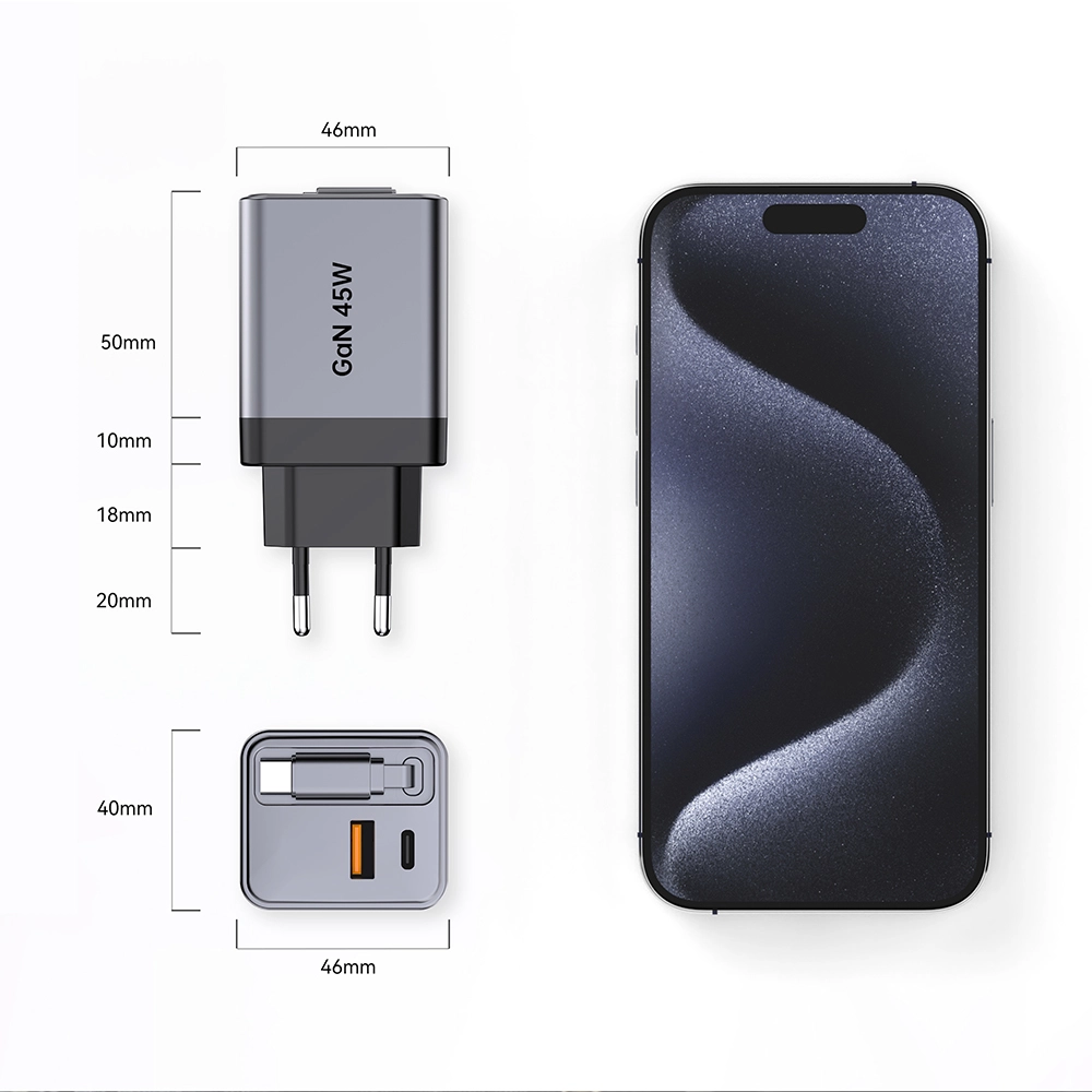เครื่องชาร์จ PD ปลั๊ก AC ของสหภาพยุโรป 45W พร้อมสายเคเบิลชนิด c แบบยืดหดได้ รายละเอียดสินค้า