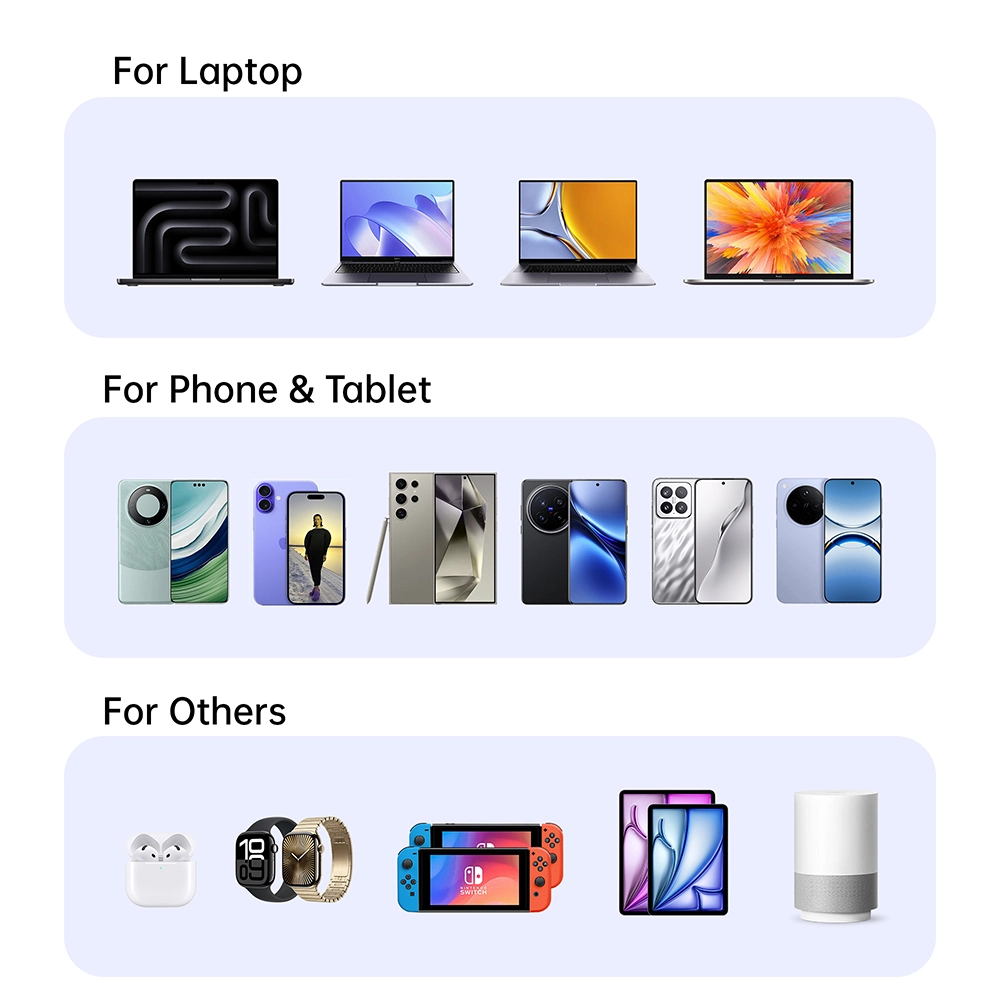 ความเข้ากันได้สากล: เครื่องชาร์จ pd ของเรามาพร้อมกับเทคโนโลยี Power Delivery (PD) ทำให้สามารถใช้งานร่วมกับอุปกรณ์ได้หลากหลาย รวมถึงสมาร์ทโฟน แท็บเล็ต และแม้แต่แล็ปท็อปบางรุ่น เป็นโซลูชั่นการชาร์จขั้นสูงสุดสำหรับอุปกรณ์ทั้งหมดของคุณ
