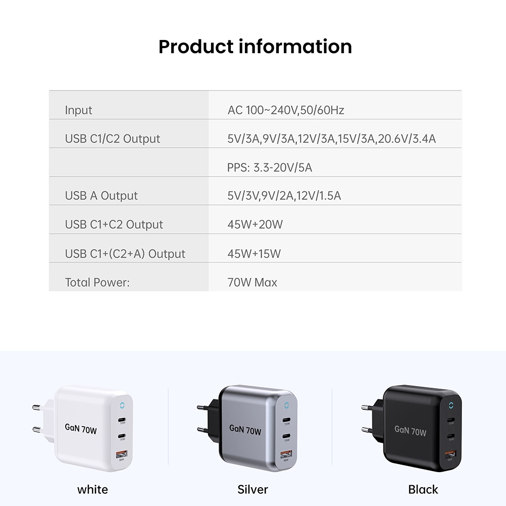 C1/C2 เอาต์พุต: 5V3A,9V3A,12V3A,15V3A,20.6V3.4A (สูงสุด 70W) PPS: 3.3-11V 4.05A เอาต์พุต USB-A: 5V3A,9V2A,12V1.5A 3.3-11V 2A(สูงสุด 22W) C1 + C2 เอาต์พุต: 45W + 20W C1+C2+USB-A เอาต์พุต: 45W+5V3A ทั้งหมด:70W |