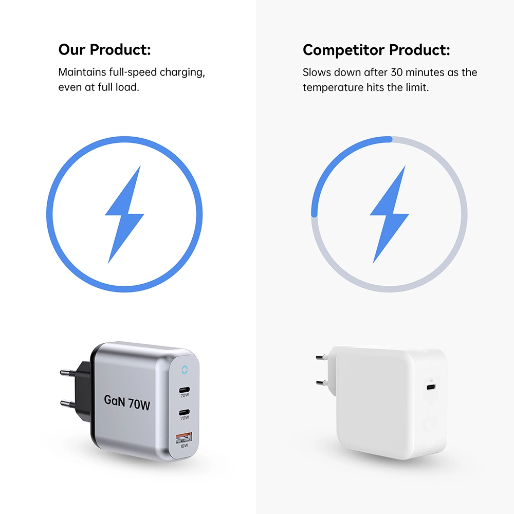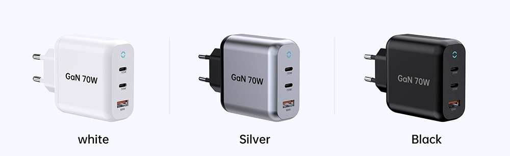 ที่ชาร์จด่วน 70W PD ที่ทนทานของ Starwell สำหรับแท็บเล็ต latpop หรือที่เรียกว่าเครื่องชาร์จเร็ว GaN 70W: 2C1A ตอบสนองความต้องการรายวันสำหรับการชาร์จโทรศัพท์มือถือและอุปกรณ์แท็บเล็ตอย่างรวดเร็ว ขนาดเล็ก สมรรถนะแข็งแกร่ง พร้อมเทคโนโลยีแกลเลียมไนไตรด์ขั้นสูง เมื่อใช้ในพอร์ตเดียว กำลังเอาต์พุตสูงสุดของอินเทอร์เฟซ USB-C1 คือ 70W เมื่อใช้ทั้งสองพอร์ตร่วมกัน USB-C1 จะยังคงชาร์จเร็ว 45W PD รองรับโปรโตคอลการชาร์จเร็วหลายโปรโตคอล รวมถึง PD3.0, PPS, QC4+ และ QC3.0 ทำให้มั่นใจได้ถึงความเข้ากันได้ในวงกว้างกับอุปกรณ์ต่างๆ