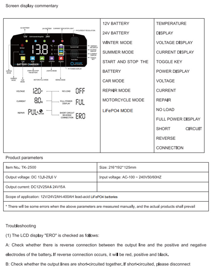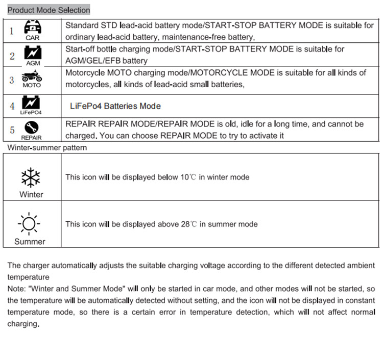 รองรับแบตเตอรี่ประเภทกว้าง: ใช้งานได้กับแบตเตอรี่เคมีต่างๆ รวมถึงแบตเตอรี่ Standard Flooded (เปียก), AGM (แผ่นกระจกดูดซับ), เจล และแคลเซียม เพื่อให้มั่นใจว่าการชาร์จจะเหมาะสมที่สุดสำหรับประเภทเฉพาะแต่ละประเภท